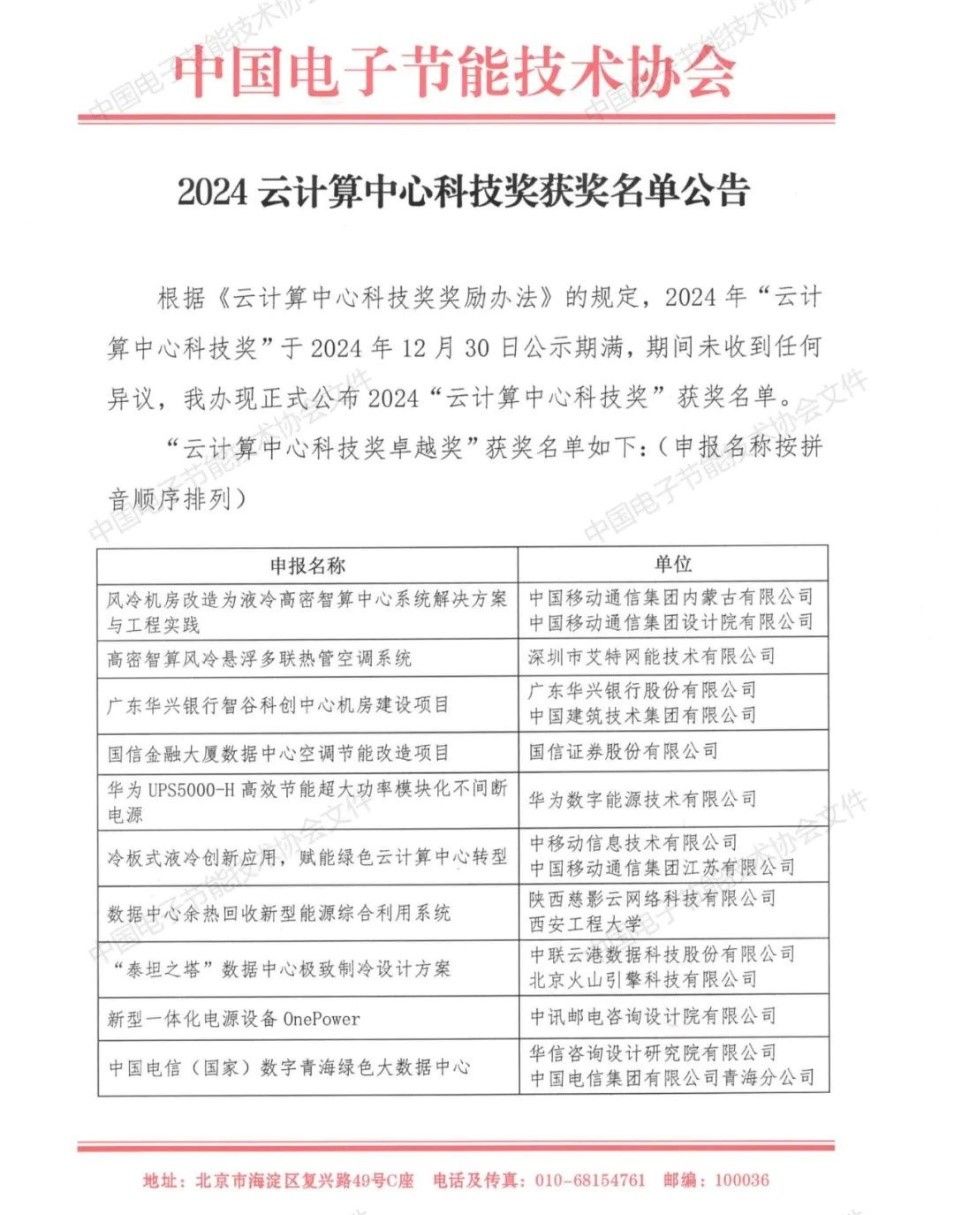据悉,云计算中心科技奖由国家科学技术奖励工作办公室审核并备案(奖励编号:0319),是社会科技奖励目录中在云计算中心科技领域给予的唯一奖励,每年评选一次。奖项评选活动由中国电子节能技术协会作为承办机构,评审办公室设在中国电子节能技术协会数据中心节能技术委员会。