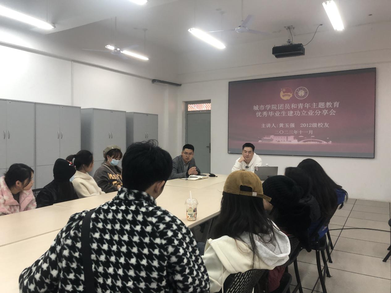 11月8日下午,城市学院举办团员和青年主题教育之优秀毕业生校友建功立业分享会。学院党委委员、院长助理胡星哲,学院团委书记陆瑞成、2020级环境设计专业毕业生参加分享会。分享会由奇幻美术体验馆创始人、我校环境设计2012级校友黄玉强主讲。