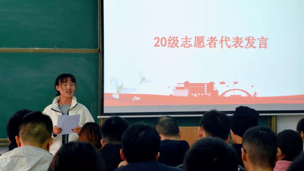接着,20级优秀志愿者代表王哲曦同学强调了志愿者应秉承的宗旨与精神,并希望志愿者们应具备“三心”既细心、耐心和热心。