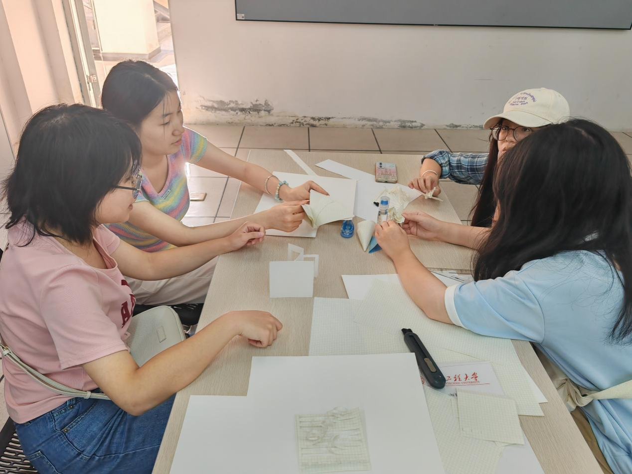 动手实践,创造无限可能。互动工作坊中,同学们全情投入,亲手制作折纸建筑模型,充分感受老师所列举的范本实例的魅力并寻找个人灵感的闪现,纷纷动手制作个人风格的折纸建筑,从简单的立方体到复杂的穹顶,每一次折纸都是一次对建筑美学的致敬,也是一次对个人创造力的挑战。