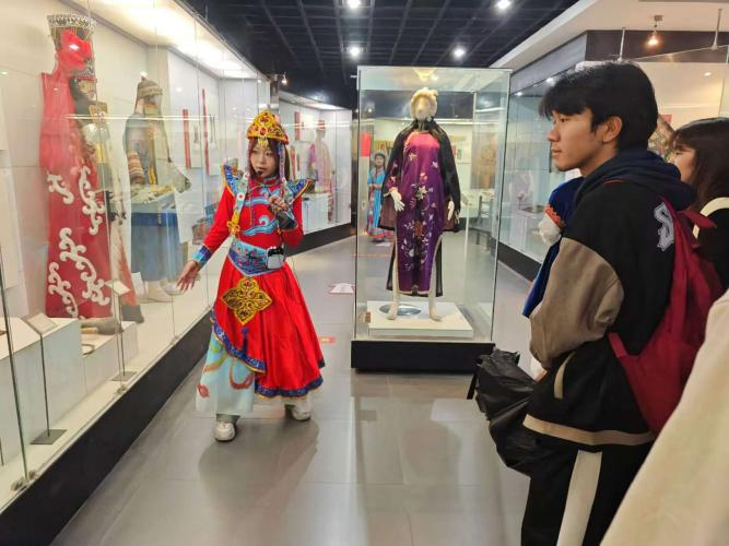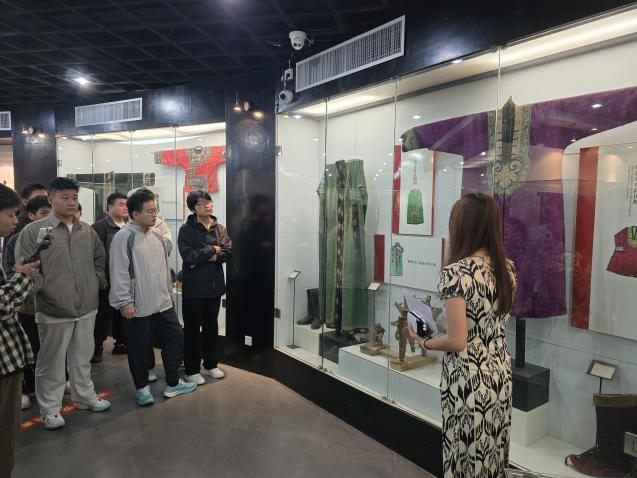 乌孜别克族讲解员城市学院赵志聪同学,接引参观学生,引导学生参观了蒙古族展柜、乌孜别克族展柜,以及重点展品。如:凤穿牡丹、蟒袍、印花模具等等。