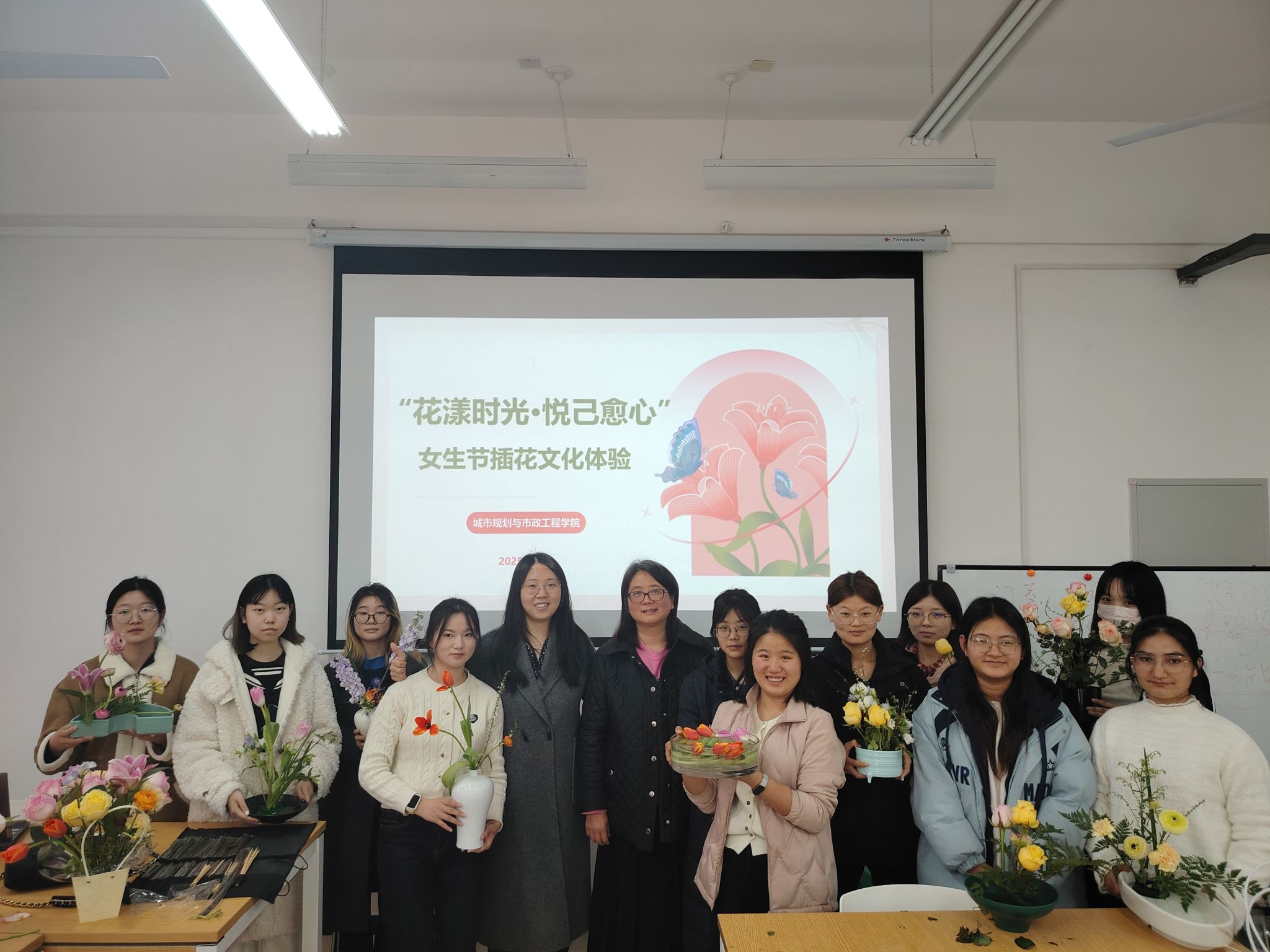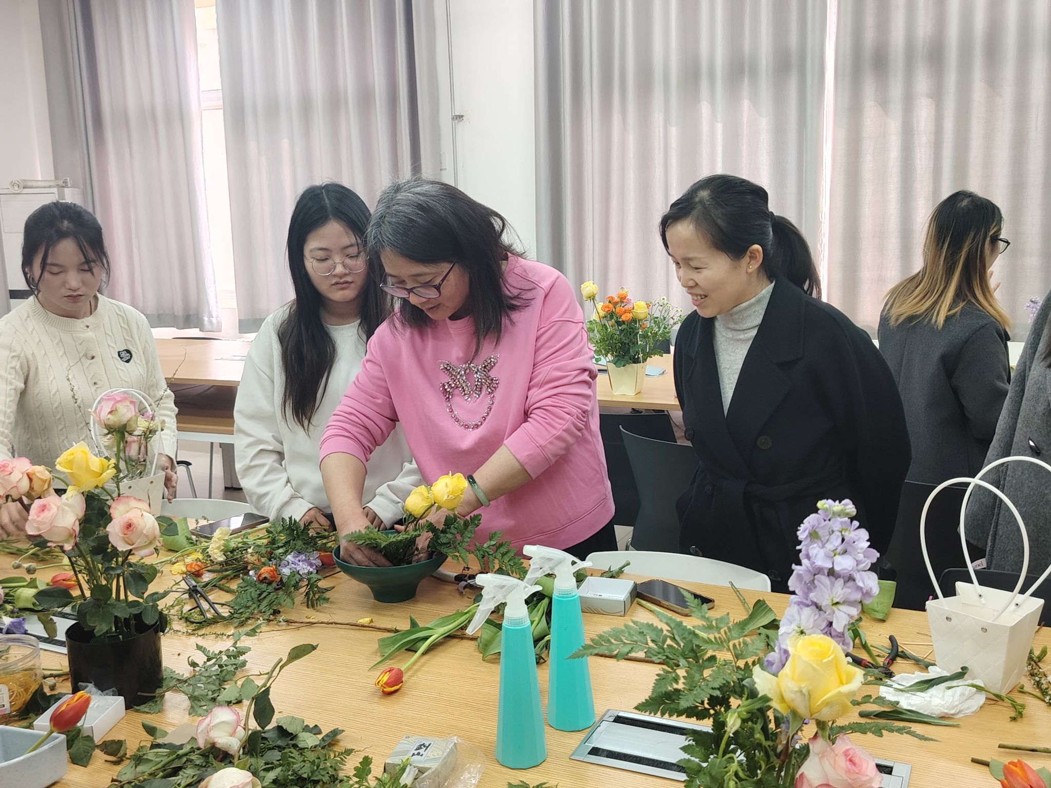 活动当天,学院邀请景观系三全育人导师团郑君芝副教授向二十余名女同学讲授了插花的基本技巧与艺术表达。从花材的选择到色系的搭配,从花器的挑选到组合设计,同学们在动手实践中逐步提升了自己的插花水平。郑君芝副教授不仅为大家讲解了插花的历史与文化,还带领大家感受了东方式插花的自然之美;通过理论与实践的结合,同学们不仅掌握了插花的技巧,还深入了解了插花艺术的多样魅力。