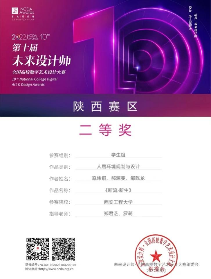 近日,第十届未来设计师·全国高校数字艺术设计大赛(NCDA)获奖名单公布,2019级环境设计专业寇炜铜等三位同学的作品《断流·重生》(指导老师:郑君芝、罗萌)获NCDA陕西赛区赛二等奖;同时kaiyun开云官方网站荣获优秀组织单位称号。
