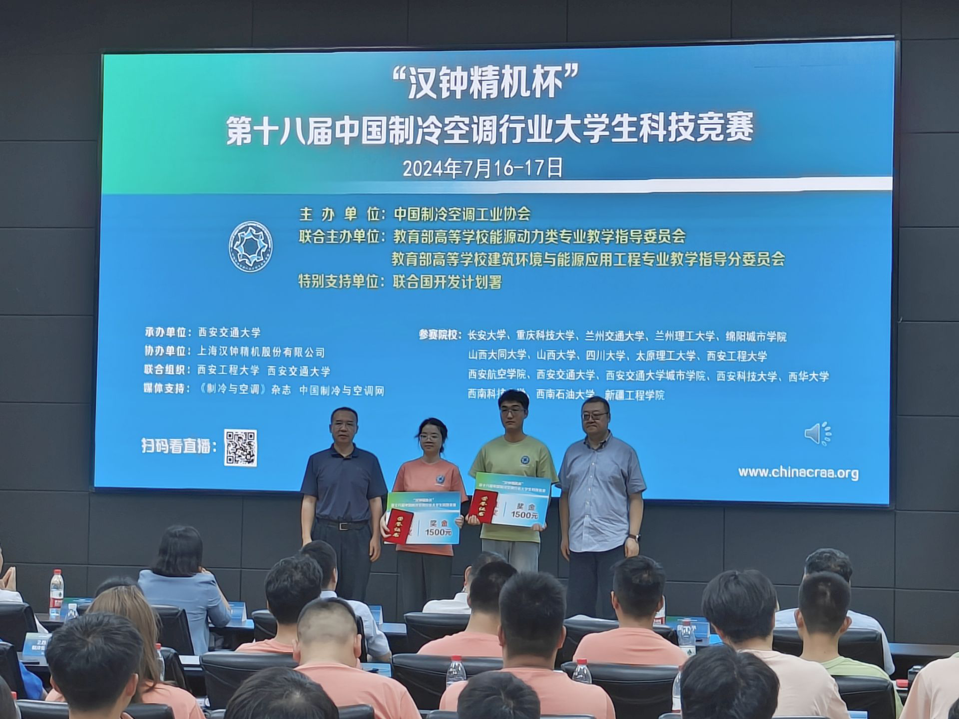 2024年7月16日至17日,由中国制冷空调工业协会主办,教育部高等学校能源动力类专业教学指导委员会和教育部高等学校建筑环境与能源应用工程专业教学指导分委员会联合主办,联合国开发计划署特别支持,西安交通大学承办,上海汉钟精机股份有限公司冠名协办的“汉钟精机杯”第十八届中国制冷空调行业大学生科技竞赛决赛在西安交通大学兴庆校区隆重举办,本次大赛主题为“新型工业化的制冷空调技术”。参与本次竞赛的院校有kaiyun开云官方网站、兰州交通大学、长安大学、山西大学、西安科技大学等18所高校。