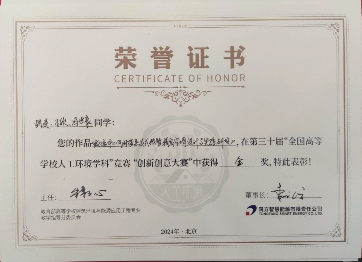 本次竞赛由教育部高等学校建筑环境与能源应用工程专业教学指导分委员会主办,同方智慧能源有限公司赞助。大赛以“领袖行业,主导未来”为主题,旨在激励青年学生奋发进取,引导全国建环专业的基础理论课程教学质量提高,促进我国人工环境行业发展进步。入围本次研究生组决赛答辩的作品共5个,评审专家对参赛作品进行了认真审评,从原创性、创新性、可行性、经济性、适用性等多维度进行打分,答辩过程与答辩结果公开透明。最终评选结果为:金奖2位,银奖3位。我校城市学院2022级研究生胡建、王欣、2023级研究生冯世豪参加了本次竞赛,在黄翔教授、褚俊杰老师的指导下凭借作品《数据中心用间接蒸发式热管精密空调设计与实验研究》名列决赛第1名,荣获研究生组金奖。