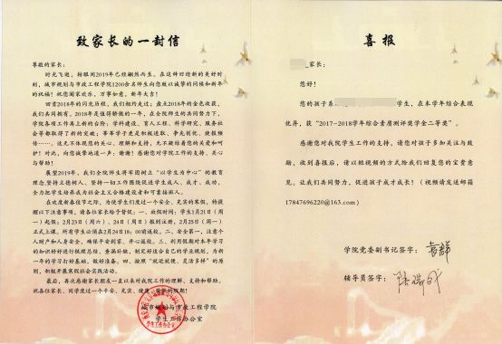 开云对在2018年度荣获国家奖学金、国家励志奖学金、综合测评奖学金、新生奖学金以及获得省级及以上科技、学术竞赛奖项的学生进行摸底统计后,在表彰先进的同时,以寄送喜报的方式向家长报喜。本次共寄出喜报210余份。
